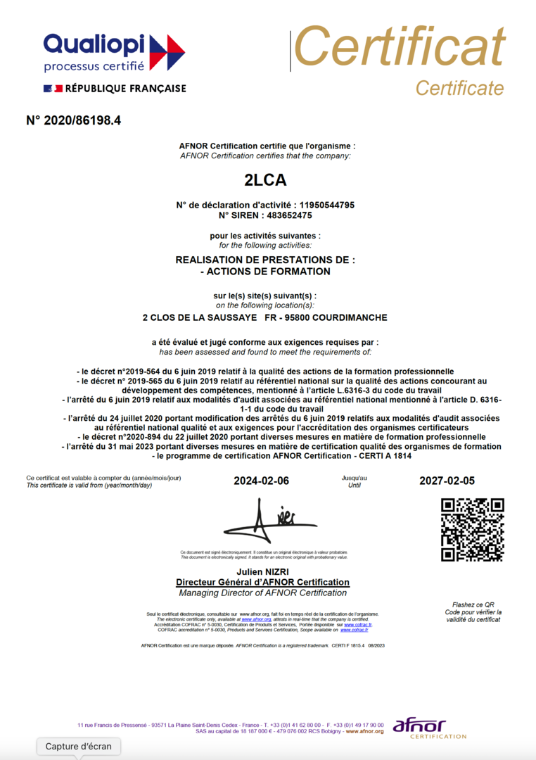 2LCA est organisme de formation certifié QUALIOPI depuis 2021.